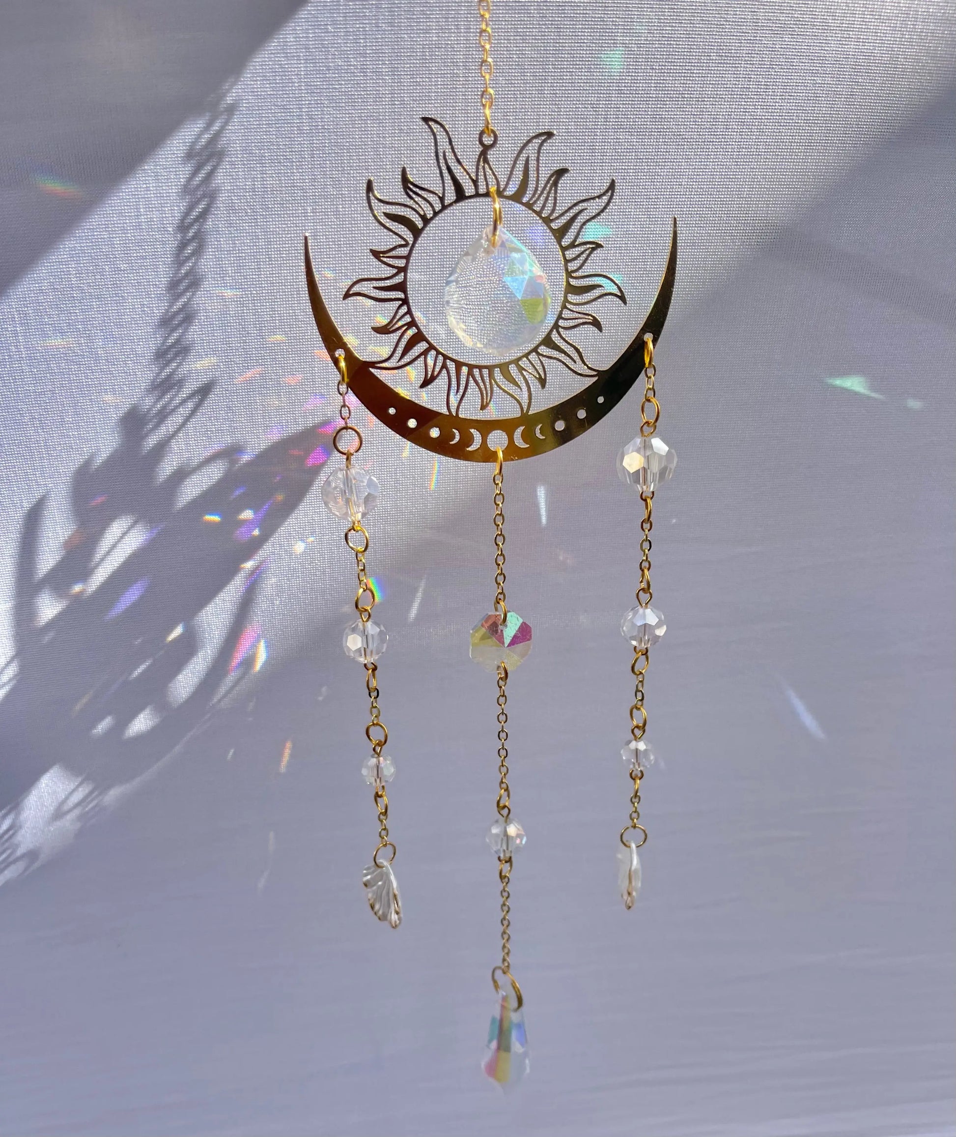 SOLEIA, un attrape-soleil fait main, avec sa forme emblématique de soleil et orné de petits coquillages, il capturent la lumière naturelle. Suspendus avec soin, les cristaux captent et reflètent les rayons du soleil, créant des jeux de lumière. Cet objet de décoration artisanale invite les énergies positives du soleil à rayonner dans votre intérieur, tout en apportant une touche raffinée et lumineuse. Idéal pour embellir vos fenêtres ou un coin de votre pièce, ajoutant une atmosphère apaisante et harmonieuse.
